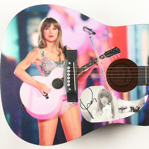 Taylor Swift autographed Ashthorpeacoustic Pink "Eras Tour" guitar. This is a beautiful display item! The acoustic guitar measures approximately 38" in length and has been autographed on a CD cover that has been repurposed as a pick-guard. Taylor Swift’s autograph is guaranteed authentic.