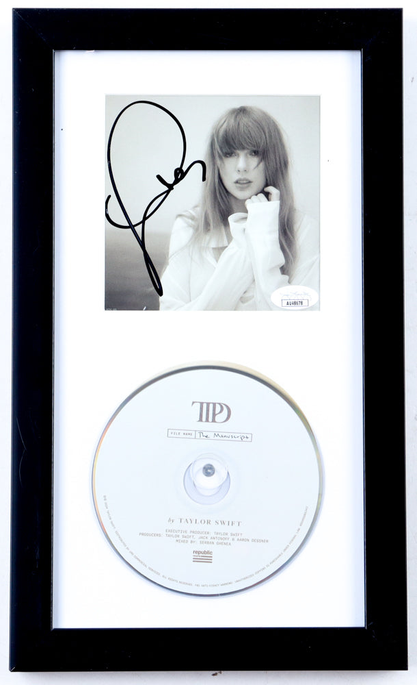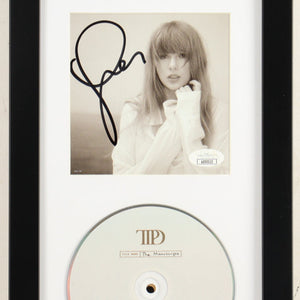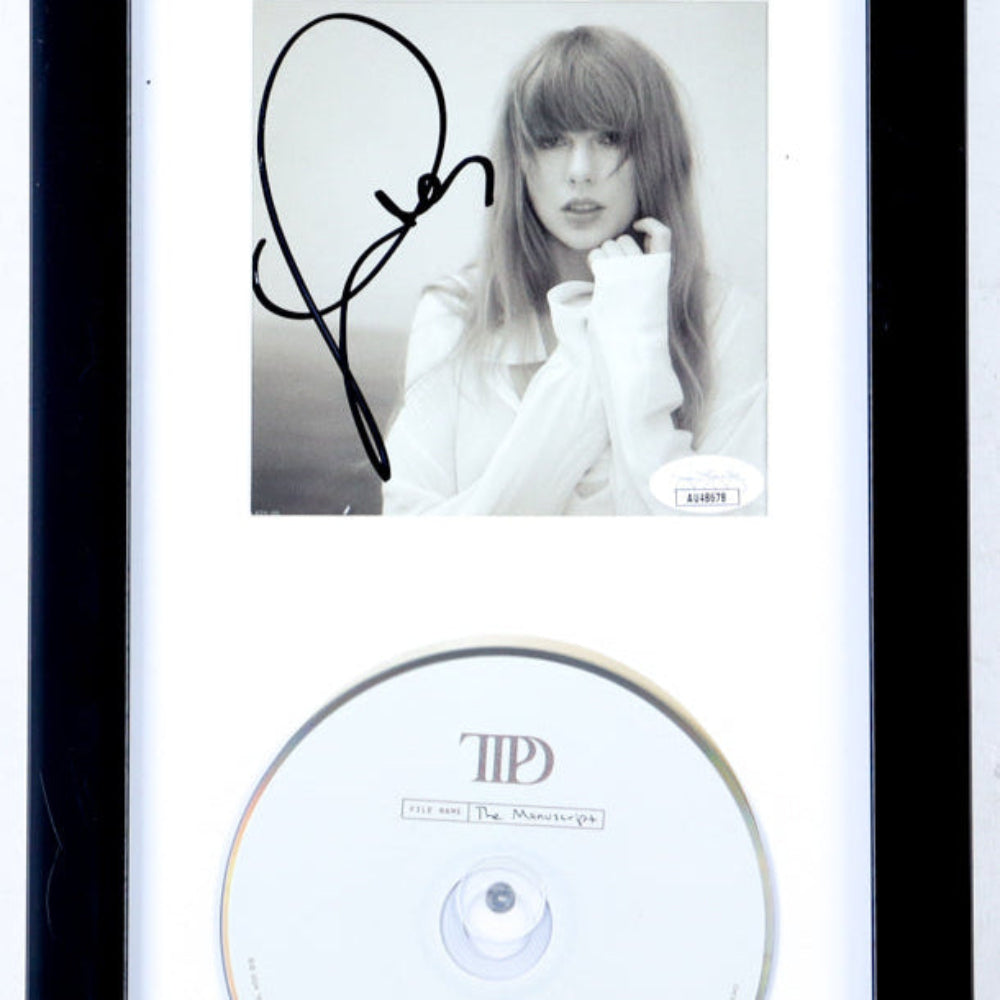 Taylor Swift autographed custom framed display measures approximately 8" x 13.5" in size. Features a "The Tortured Poets Department" CD insert that has been signed by Taylor Swift. The display also includes the disc as shown. Taylor Swift's autograph is guaranteed authentic.