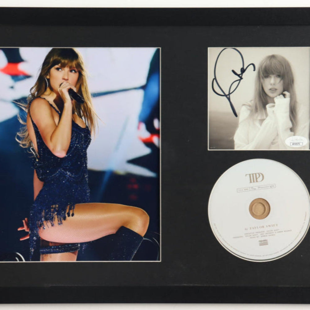 Taylor Swift autographed custom framed display measures approximately 13" x 19" in size. Features a "The Tortured Poets Department" CD insert that has been signed by Taylor Swift. The display also includes the disc as shown. Taylor Swift's autograph is guaranteed authentic.